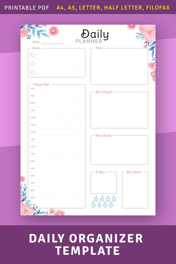 Daily Organizer Template, Daily Planner Pdf, Daily Plan, Daily Schedule, Daily Planner Sheets