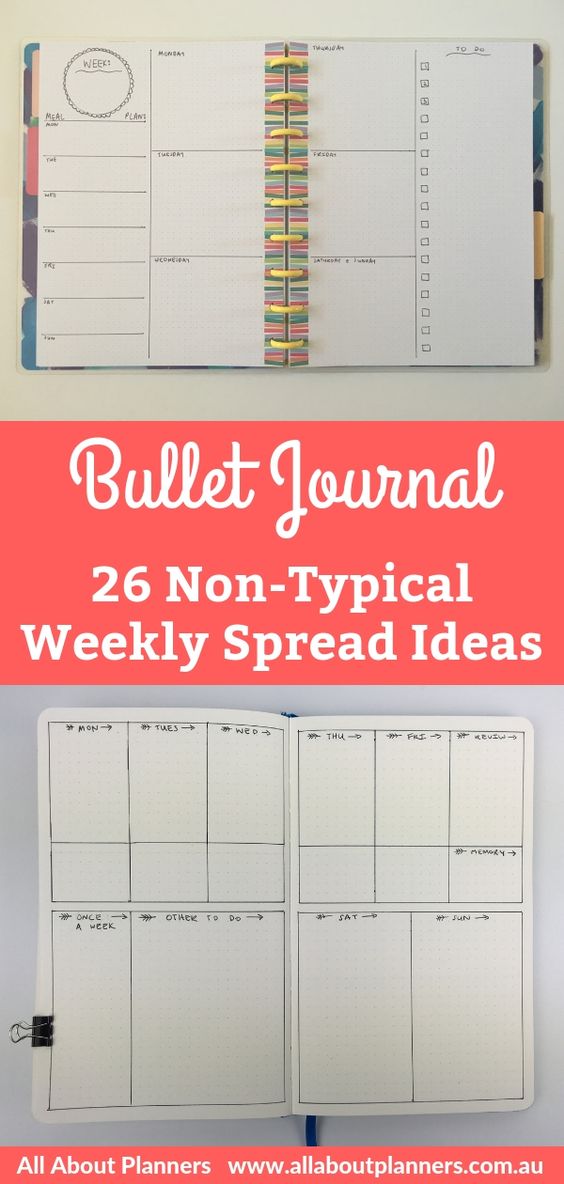 Bullet Journal Layouts: 26 Non-typical 2 page weekly spreads to try. #Small Business Planner #Fitness Planner Bundle Workout #Goal Planner #Productivity Planner #Self Care Planner #Mindfullnes Printable Planner Spiritual #Planner Decorating Ideas #Diy Planner Notebook Layout #How To Make A Planner